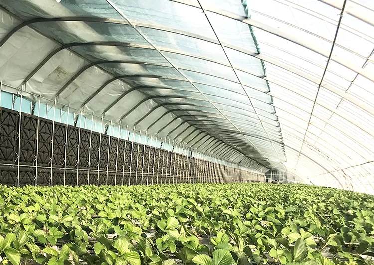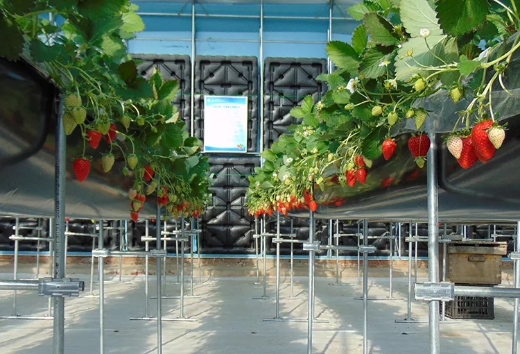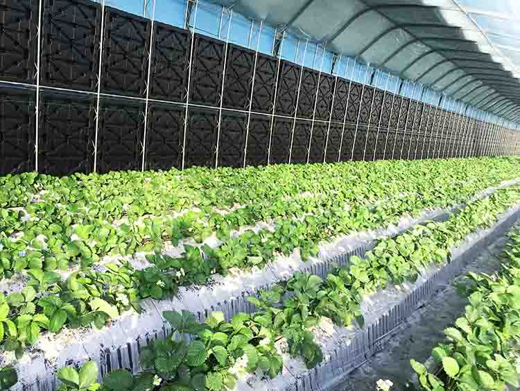 為了達(dá)到合理蓄熱的目的,日光溫室蓄熱系統(tǒng)也經(jīng)歷了土墻、磚墻墻體保溫到相變材料的不斷更新。受傳統(tǒng)日光溫室蓄熱材料粘土或磚本身的物理性質(zhì)的限制,能達(dá)到的蓄熱量有限。理論上,選用比熱容更高的水可能會收獲更多蓄熱量。粘土或磚的比熱容分別僅為水的1/3和1/4,也就是說單位質(zhì)量的水蓄熱內(nèi)外雙保溫裝配式日光溫室蓄熱體每升高或降低1℃可以吸收或放出的熱量是土墻或磚墻3~4倍。實踐證明,水蓄熱墻體的蓄熱能力顯著強于土墻或磚墻。崔世茂教授介紹說,在水蓄熱內(nèi)外雙保溫裝配式日光溫室中,水箱墻體蓄熱方面有明顯創(chuàng)新,蓄熱技術(shù)主要是利用太陽能白天照射加溫水箱,晚上通過水箱持續(xù)放熱保持溫室內(nèi)溫度可達(dá)到6 ℃以上(同期室外氣溫-30 ℃),夜間增溫效果顯著,這樣就能夠保證溫室中越冬生產(chǎn)栽培的草莓和番茄可以正常生長,產(chǎn)量高、品質(zhì)好!