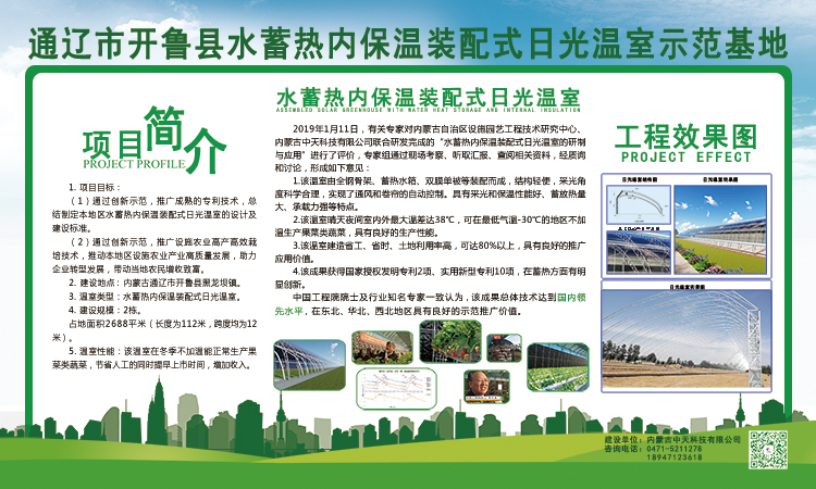 1.通過創新示范,推廣成熟的專利集成技術及產品,總結制定內蒙古通遼市及周邊地區水蓄熱內保溫裝配式日光溫室的設計及建設標準。